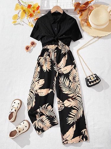 Design: Button down, short sleeve, drop shoulder crop blouse, spaghetti strap, wide leg jumpsuit