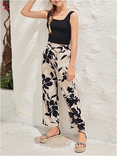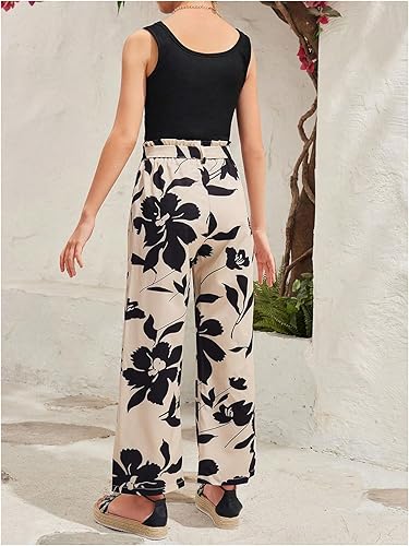 Features: 2 piece summer outfits for teen girls, sleeveless, scoop neck, cropped tank tops, floral print, straight leg, long pants, with belt and pockets