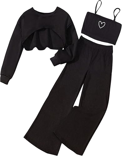 Design: Long sleeve, heart print, crew neck, wide leg, super crop tee shirts, cami top, baggy pants, 3 piece outfits for girls