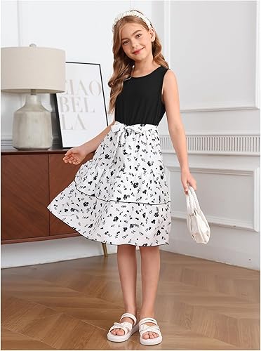 Features: Floral print, double layer, bow belted, sleeveless, summer tank dress, ruffle a-line midi dress