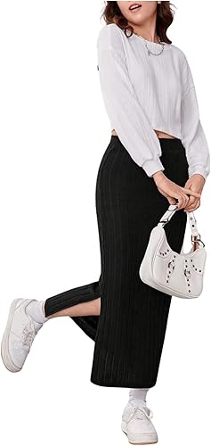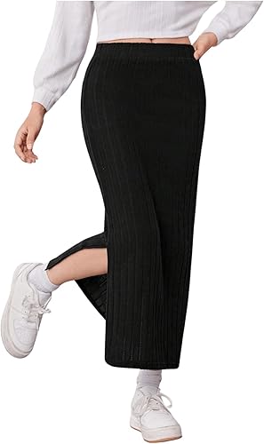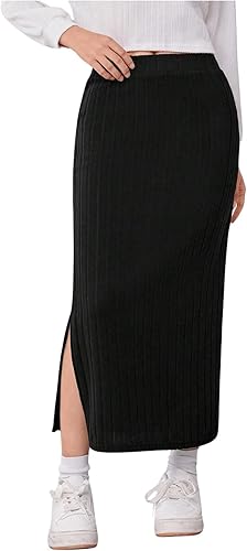 Design: High waist, elastic waistband, rib knit, split slit hem, rib knit, solid color, midi length, casual style