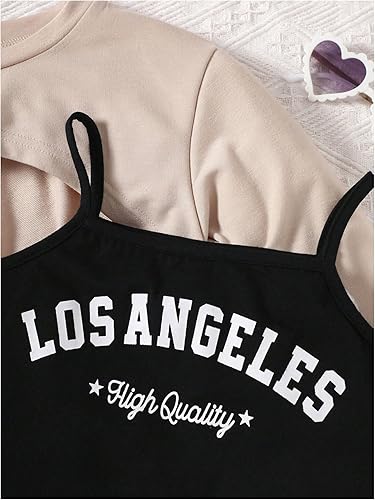 Features: Skirt set, letter graphic cami top, high low hem sweatshirt, pleated skirt, 3 piece set