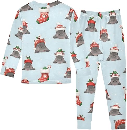 Pajama Sets Long Sleeve Christmas Hippo with Santa Hats Soft Comfy Sleepwear 2 Piece PJS 3-8T(6 Years)