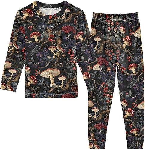 Pajama Sets Long Sleeve Mushroom Floral Pattern on Black Soft Comfy Sleepwear 2 Piece PJS 3-8T(6 Years)