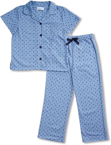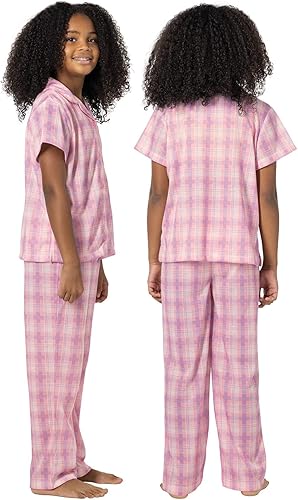 Two-piece matching set - Short sleeve, button-front, collared top with a chest pocket; loose fit, elastic waistband, faux drawstring; these all over patterned pajamas for kids are a great mid to warm weather addition to any child's closet