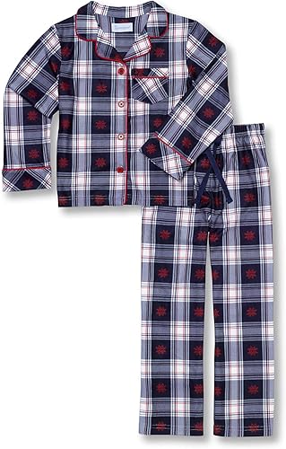 Two-piece matching set - Long-sleeve, button-front top and full-length, relaxed fit pants; a timeless addition to any fall through spring sleepwear wardrobe, these two-piece Kids pajamas feature a notched collar, a rounded breast pocket, an elastic waist, and a faux drawstring.