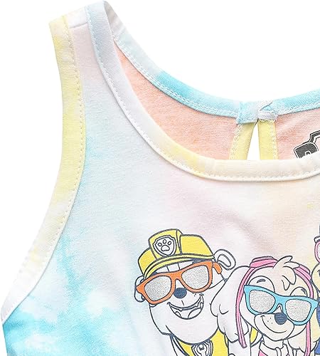 Dress your toddler girl in this sleeveless romper shorts pack for girls featuring her favorite Paw Patrol characters, Skye, Chase, Marshall, and Rubble. Available in sizes as 2T girls clothes, 3T girl clothes, 4T girl clothes, 5T girls clothes, size 6X girl clothes, and size 7 girls clothes