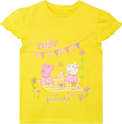 The cute buttercup yellow top features a print of Peppa as a fairy and 'Tea Party with Friends' printed above The top is detailed with embroidered butterflies, dragonflies, and flowers, and is completed with a ruffle lace hem