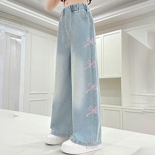 Pink Bow Jeans for Teen Girls Wide Leg Jean Kids Cute Elastic Waist Casual Washed Demin Pants with Pockets 5-14 Years(Light Blue,11-12 Years)