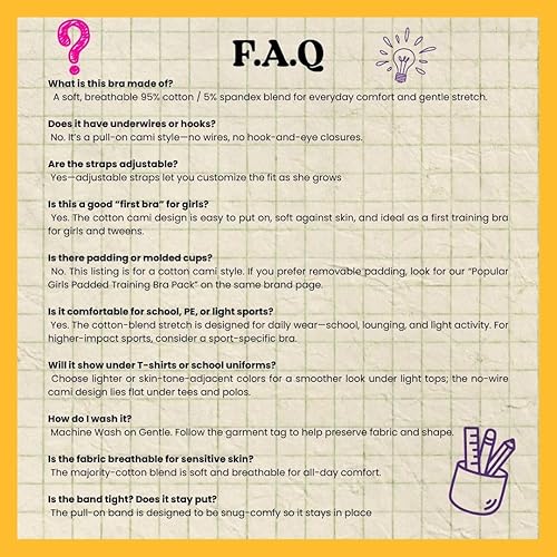 NO HOOKS OR WIRES FOR EASY ON & OFF: Pinch & Irritation-Free Cotton Bra for Amazing Comfort. A Simple Pull-On Design Makes These Girls Bras a Breeze to Add to Your Morning Routine. Put on The Cami Bra Just Like a T-Shirt!