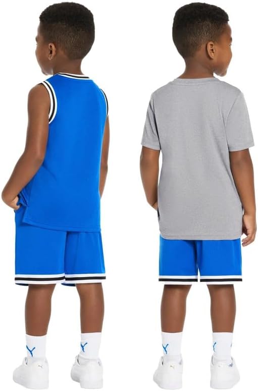 Boys’ sets (Black, Blue) include a crew neck graphic tee, sleeveless mesh jersey tank, and matching mesh shorts