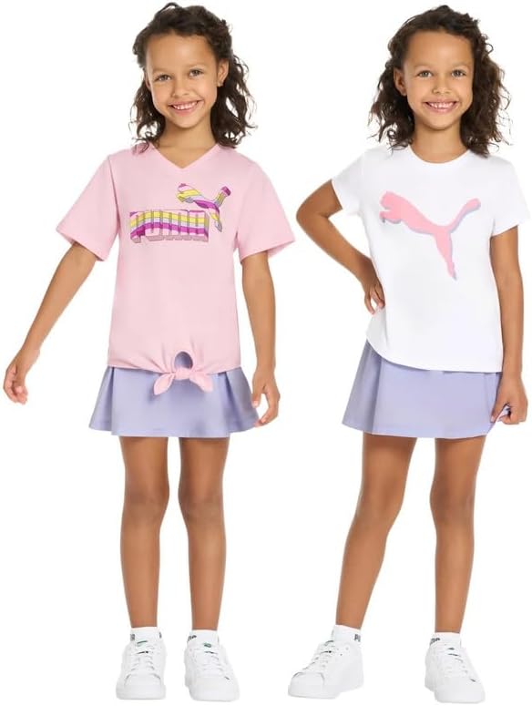 Girls’ sets (Pink, Purple) feature a tie-front graphic tee, crew neck graphic tee, and a skort with elastic waistband