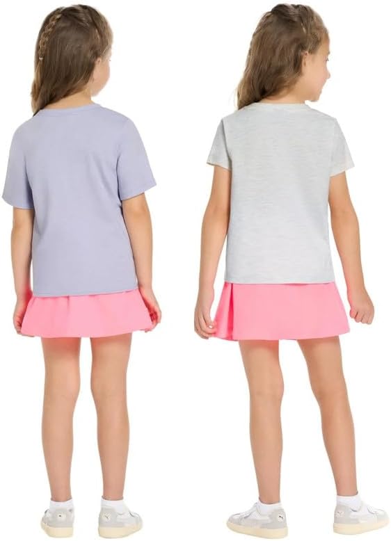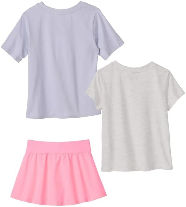 Girls’ sets (Pink, Purple) feature a tie-front graphic tee, crew neck graphic tee, and a skort with elastic waistband