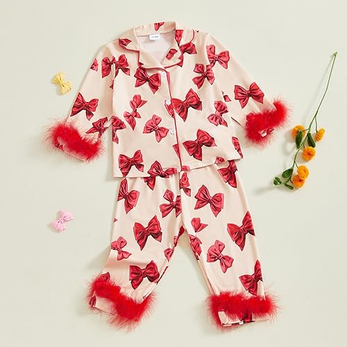 Features: Kids button-up pajamas for girls, long-sleeve, lapel collar sleepshirt pajamas, feather trim tops and pants 2 piece pajamas clothes, soft bowknot pajamas for girls