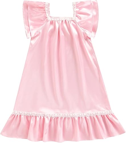 Sweet design: Lace square neck silk nightdress, loose-fit solid color nightgown dresses, double ruffles short sleeve, lace ruffle hem soft satin nightdress sleepwear make your little girls more lovely