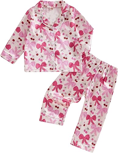Festures: Button-on sleep shirts, long-sleeves, lapel collar, button-down satin sleep tops, elastic waist long pajama bottoms, soft girls pajamas silk satin pyjamas set bowknot,cherry,strawberry,flower girls satin pajamas for kids.
