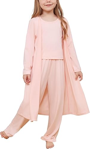 Feature: Girls pajama set consisting of a crew neck tank top, loose elastic pants and open front coat. With classic solid colors and casual loose fit, your kids will love this loungewear set.