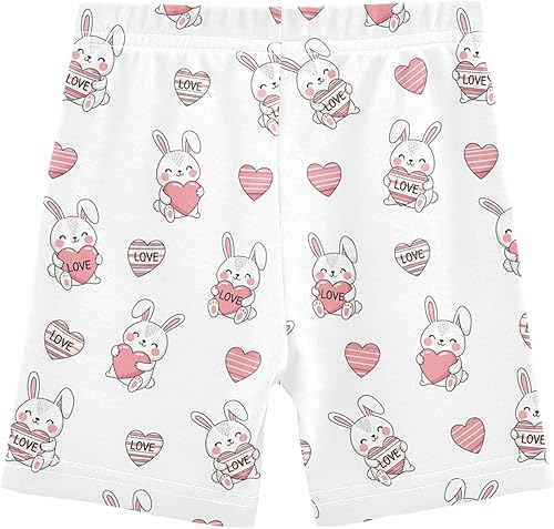 Rabbit Hearts White Girls Bike Shorts Toddler Soft Cotton Active Biker Shorts(Multi-rabbit Hearts White,10 Years)