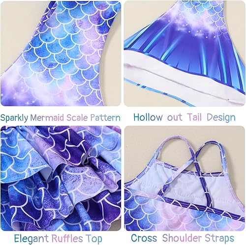 Package List: The mermaid bathing suit set includes a ruffle top, briefs,Dive into a fairytale with this whimsical mermaid swim set!