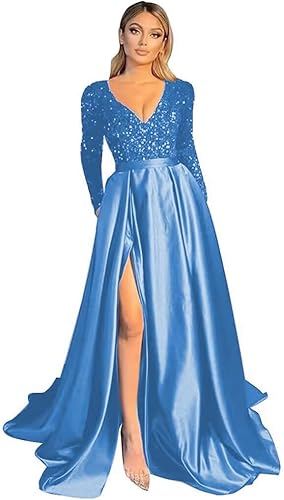 Design: V Neck Long Sleeve Prom Dresses Sequin Dress for Women Satin Evening Gowns Split Plus Size Ball Gowns for Women Formal with Pockets 2025
