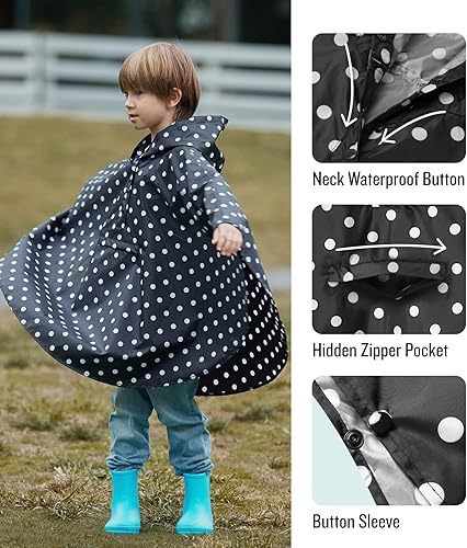 Design: Full rain poncho cover, with snaps on hood / Zippered front pocket, for daily necessities items / Various colors and cartoon patterns, bring joy to kids