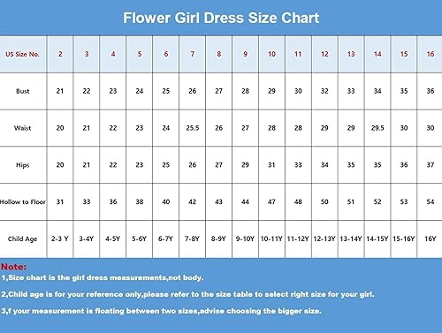 Size: Please refer to the size chart before ordering and chose the right size for your child.If you need a customized size of the princess girls formal dress,please provide us with the size including bust,waist,hip,hollow to floor