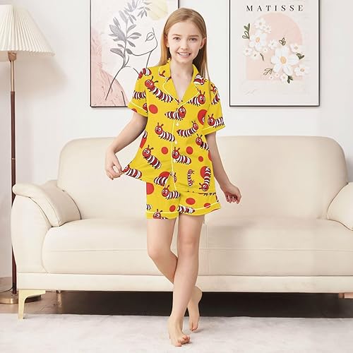 Satin Pajama Sets Short Sleeve Caterpillar Red Dots Yellow Button Down Silky Nightwear 2 Piece PJS 5-14Y(Caterpillar Red Dots Yellow,Large)