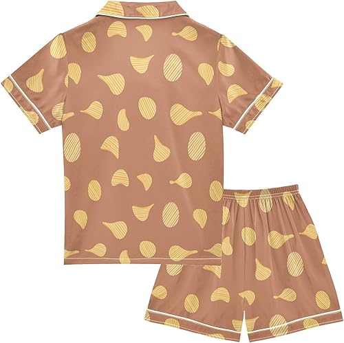 Satin Pajama Sets Short Sleeve Orange Background Potato Chips Button Down Silky Nightwear 2 Piece PJS 5-14Y(Orange Background Potato Chips,Small)