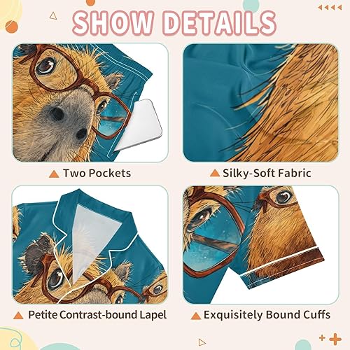 Satin Pajama Sets Short Sleeve Stylish Capybara Funny Button Down Silky Nightwear 2 Piece PJS 5-14Y(Stylish Capybara Funny,Small)