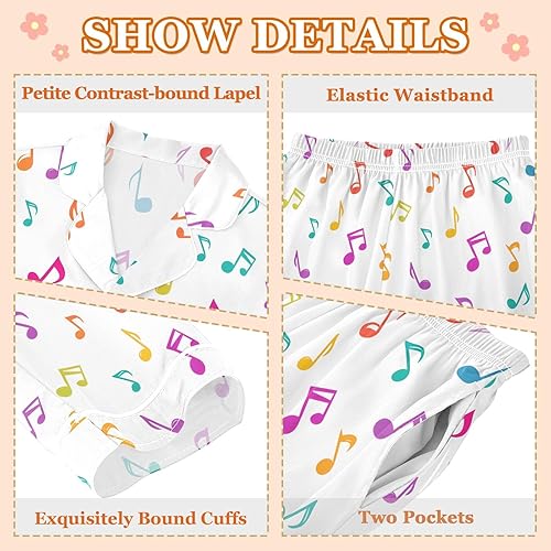 Satin Pajamas Set, Musical Notes Pattern Button Down Long Sleeve 2 Piece PJ Set 5-14Y Multicolor