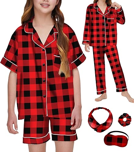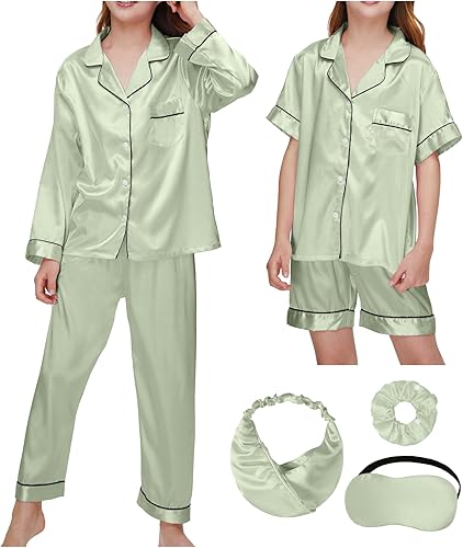 4 Piece girls pink pajamas:This silk pjs for girls comes with 1 short-sleeved pajama top, 1 pair of girls' pajama shorts, 1 long-sleeved pajama top, 1 pair of pajama pants, 1 sleep mask, 1 satin headband, and 1 scrunchie. This 4-piece kids silk pajamas girls is versatile and can be mixed and matched according to different temperatures, meeting your year-round homewear needs