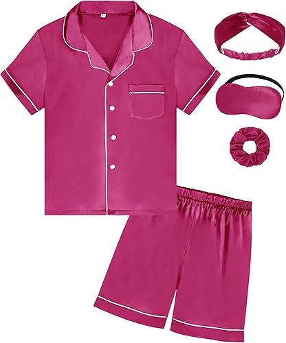 Luxuriously Complete Satin Girl Pajama Set: Our premium girls satin pajamas includes everything your child needs for a cozy night in—short-sleeve button-up top, elastic-waist shorts, soft eye mask, matching scrunchie, and hair band. Ideal for bedtime, pajamas for girls parties, or relaxing weekends