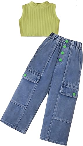 Fashion Design: Ribbed crop tank top with sleeveless, round neck, solid color design, with wide leg jeans. Girls two-piece set is comfortable to wear