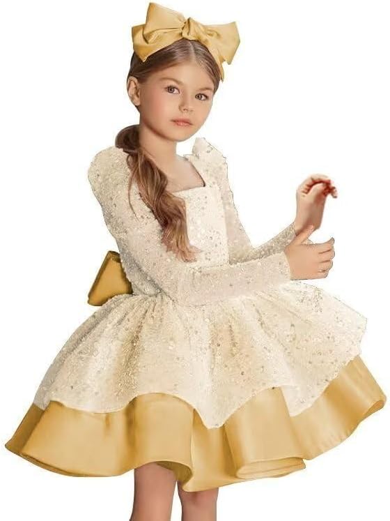 Features: Sequin Pageant Dress for Girls,Knee Length, high waist Dresses,Square Neck,Satin,Long Sleeve,Sequin,Layered.