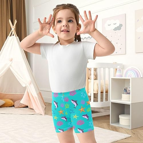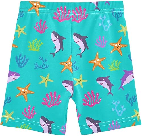 Shark Starfish Teal Girls Bike Shorts Toddler Soft Cotton Active Under Dress Shorts(Multi-shark Starfish Teal,10 Years)