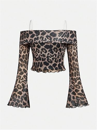 Features: girls' clothing sets, 2 piece outfits, leopard print, flared long sleeve, off shoulder, slim fit, crop top, high elastic waist, bell bottom, flare pants