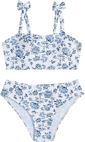 Feature: 2 piece swimsuit for girls, flower print, bowknot decor, low rise, open back, holiday bikini sets