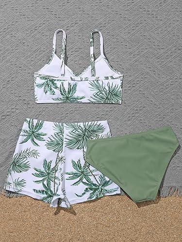 Features: 3 piece tropical palm tree print bikinis; wrap v neck spaghetti straps removable padding wireless bikini top; high waisted bikini bottom; elastic waist wrap board shorts