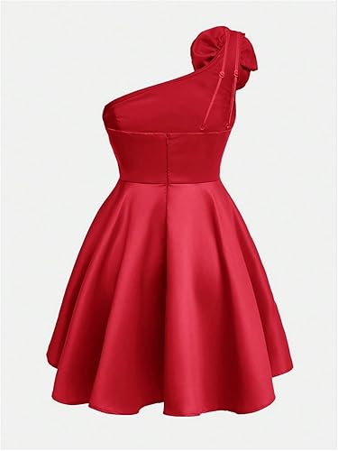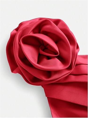 Features: satin dress for girls, one shoulder, sleeveless, back center zipper, high waisted, 3D flower decor, flared hem, cute and elegant