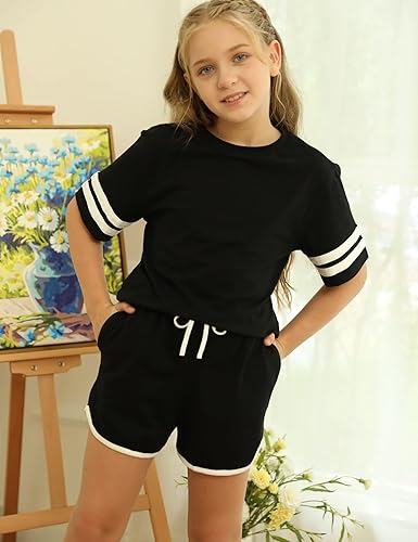 Features: Girls tops with simple crew neck, solid color, short sleeve striped tee and loose fit, relax style. Shorts are elastic waist design make kids more convenient and comfy. Note:The bow is a decoration, not strap tie. Size for girls 6-15 years old , little or big kids