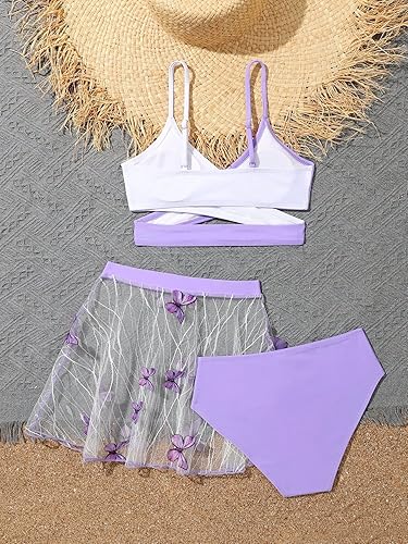 3pcs colorblock bikini sets with beach skirt cover up for girls