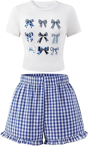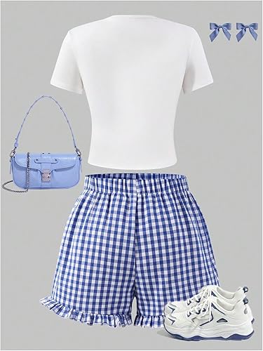 Feature: Teen girls summer clothes, round neck, short sleeve, slim fit, bow & gingham pattern, elastic waist, adorable and youthful style, fashionable