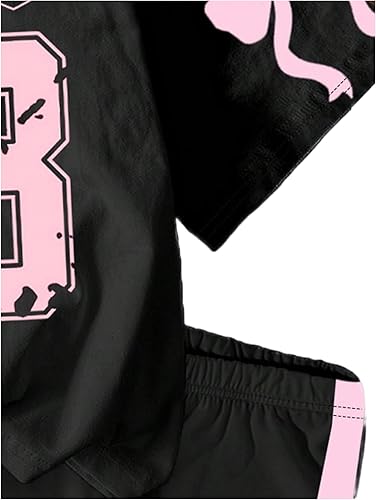 Features: Summer 2 piece set, bow print, number letter, contrast binding, short sleeve, round neck, cute graphic tees and biker shorts set, fashionable