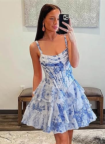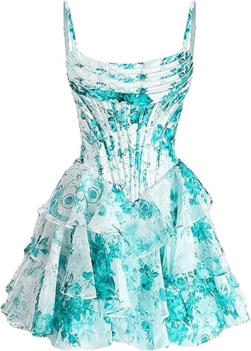 Features: This elegant homecoming dress features spaghetti straps, sleeveless, tiered a-line hemline, a line, Corset back detail, reveals a corset-style lace-up back, offering an adjustable and secure fit, and adding a touch of romantic detail.