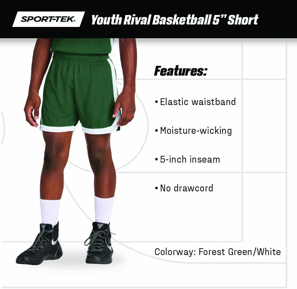 SPORT-TEK Youth Rival Basketball 5 Short YST901(Forest Green/ White,Small)