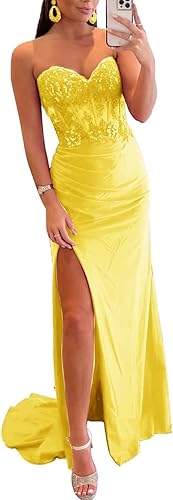Strapless Prom Dresses 2024, Sparkly Mermaid Prom Dresses, Satin Prom Dresses Mermaid 2024, Satin Prom Dresses 2024, Strapless Prom Dresses for Women, Sparkly Evening Party Gowns for Women, Sexy Mermaid Prom Dresses, Sweetheart, High Slit, Adjustable Lace Up Back, Tight, With Train, Floor Length, Plus Size, Floor Length, Built-In Bra
