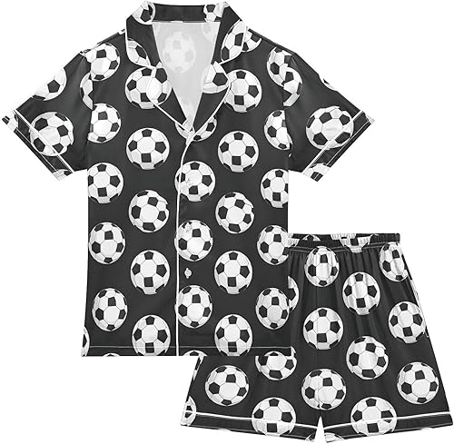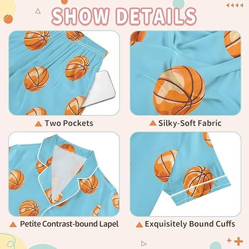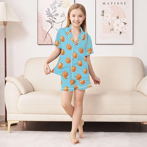 Summer Pajamas Silk Sleepwear 2 Piece Satin Pjs Short Sleeve Loungewear 5-14 Years(Blue Basketball,12 Years)