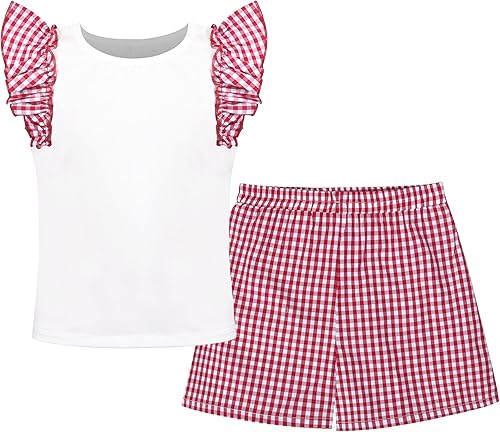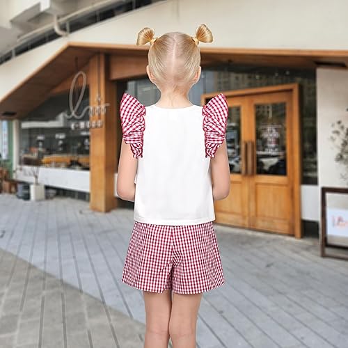 This girls' 2 piece outfit includes a white lace top dress and a pair of shorts. The dress has ruffle puff sleeves and an eyelet lace pattern on the neck and chest. Made of cotton, it is cool and cozy, ideal for summer. Suitable for casual occasions like family outings, picnics, or beach trips. Its lightweight design makes it perfect for warm-weather activities.