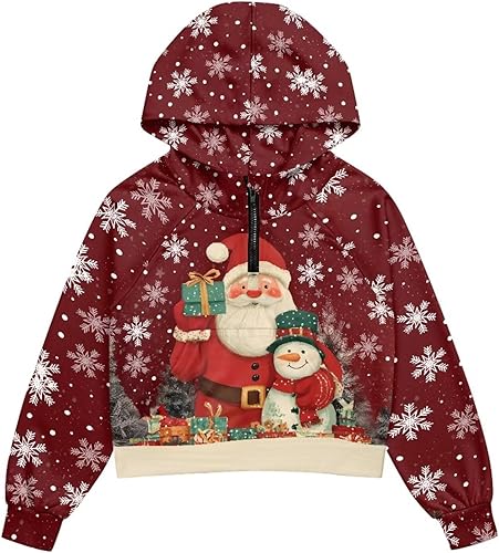Suobstales Half Zip Pullover for Girls Kids Cropped Hoodie Y2k Hooded Sweatshirt Long Sleeve Fall Winter Clothes with Pockets(Santa Claus Snowman Gift Snowflake,13-14 Years)