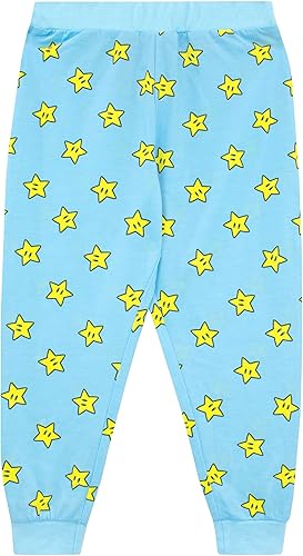 A long sleeve pink pyjama top with blue sleeves and a print of Mario and friends on the front. Paired with blue pj bottoms with an elasticated waist and ankle cuffs, featuring an all-over motif of super stars